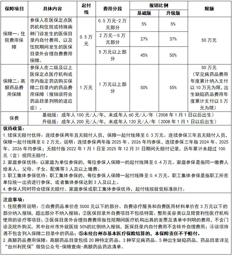 2026台州市利民保高额药品费用保障政策